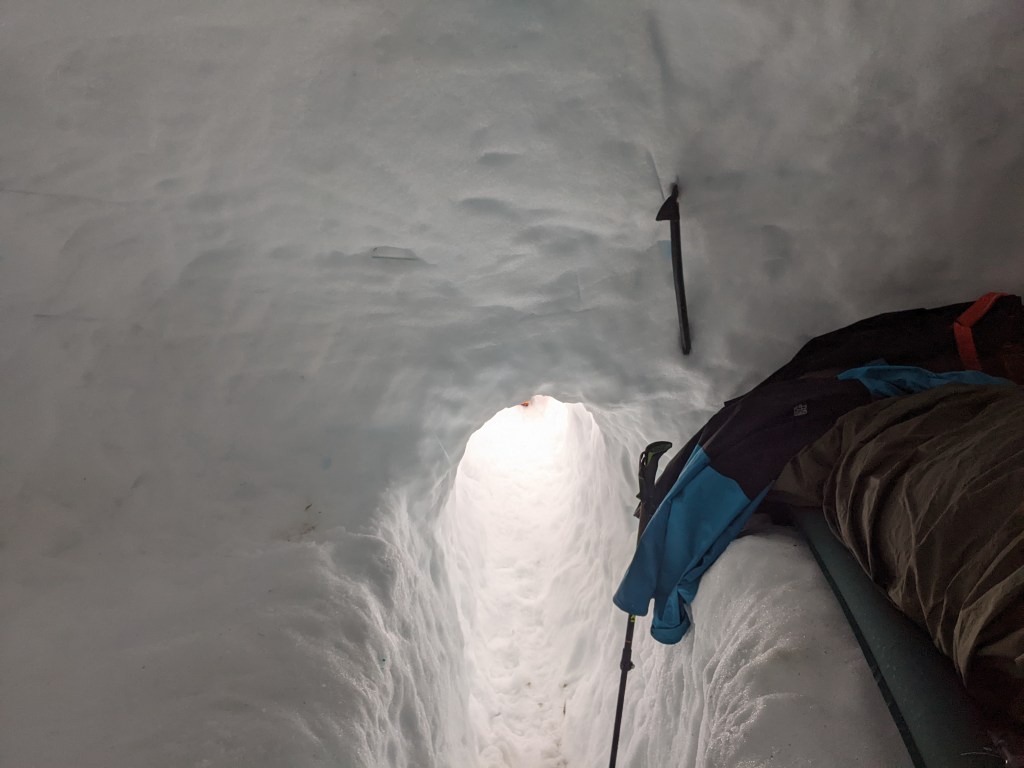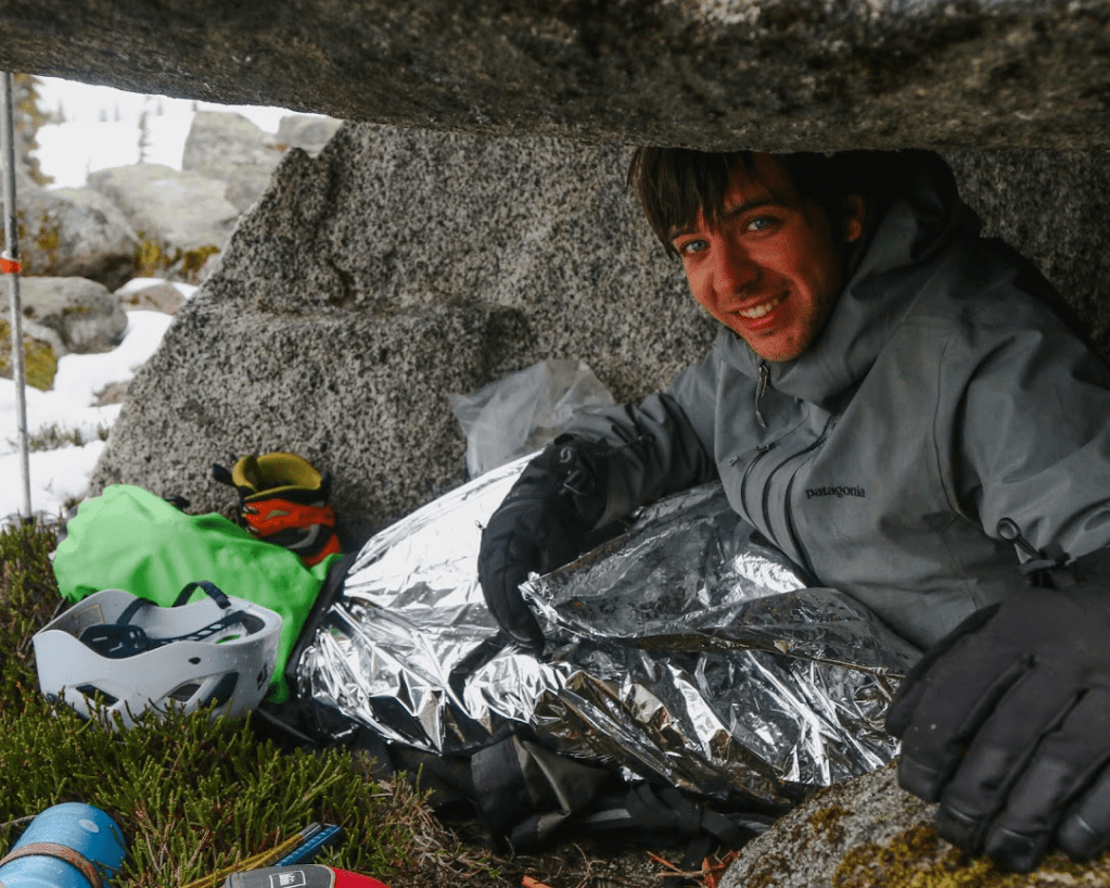 I felt pretty disappointed by the whole affair. I knew that I could push through the pain and continue making it up the ridge, but I was unwilling to push my luck in such a remote area. From where we stopped for lunch I knew I could very easily and safely make it back to our predetermined bivy spot. We were about to enter some more dangerous terrain, where turning back would require the entire crew to retreat alongside me. As the tag-along for the trip, I didn’t want to risk jeopardizing a summit attempt, or trying to push through the pain and consequently putting myself and my crew at risk. As we wrapped up our lunch, I said goodbye to my friends and very slowly made my way back to the saddle. When I got to the rocks, I walked around to some standing dead trees and collected a couple twigs and branches. I figured that it might get cold sitting about for a few hours, and I had a fire starter kit in my first aid kit that could help later on. I found a perfect one-man wide cave among the rocks and began setting myself up to wait out the crew. I put my poles and axe outside the cave to mark my spot. I then emptied my pack and laid it down flat, put on all of my layers and lay upon my bag. I took my wet boots off and wrapped my feet in a t-shirt and then stuffed them in a dry-bag to keep them warm. Finally, I pulled out my emergency heat blanket and wrapped myself in an airtight cocoon. As soon as I was happy that I would stay warm and dry, I felt myself dozing off and gave in to the feeling. I awoke about an hour later, and wondered if the visibility had improved and if I’d be able to see more of the mountains around us. I got up and saw that the light rain had turned into a blizzard and snow was howling all around my cave. Inside was still toasty warm, and so I retreated back into my cocoon and chilled out for the next few hours.