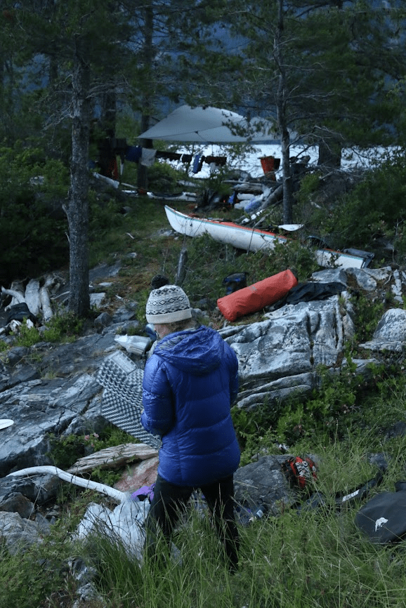 When we got back to our camp, we ate some lunch and began to transition into our water gear. We bade goodbye to our inlet end and began paddling towards a small islet about 10km along the bank. This rocky little island was only about 30m in diameter and only had space for one tent. Along the way our beautiful sun disappeared and was replaced by the strongest winds we’ve encountered so far. Our tailwind was now a headwind and we made very little progress battling the waves down the Toba. Without any other beach at which to park and wait out the storm, we pushed on against the winds. The islet had no beach on which we could easily dock our kayaks, and so we had to climb onto the bluffs and unload the kayaks while they floated beside us. It took us a while to safely get everything onto shore, but we were rewarded with an astoundingly cute little campsite. We tried to spot Champion up the valley, but the mountains disappeared into the clouds and we could see nothing.