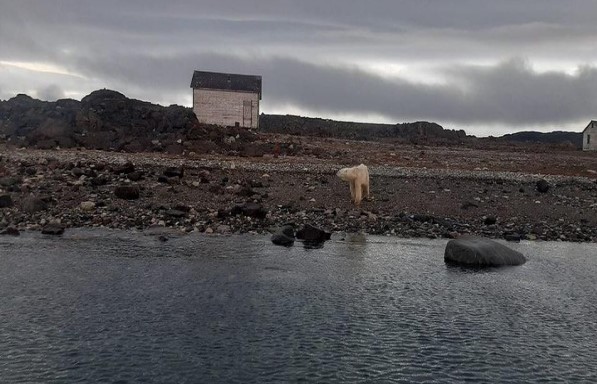 The polar bear between the cabin and the boat