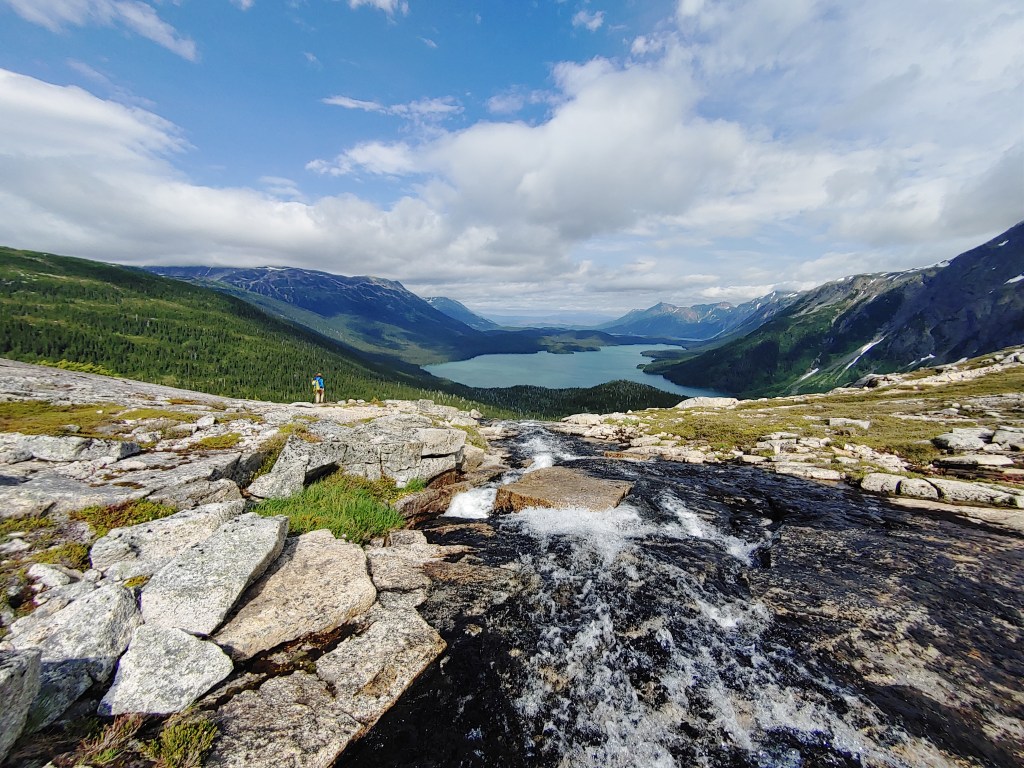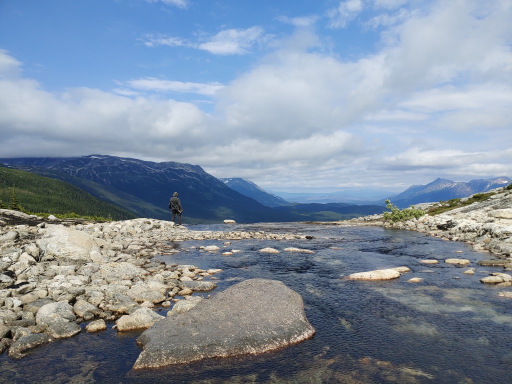 The next objective was the focal point of Mt. Stranack, a granite face with a braiding waterfall we’d seen through binoculars at the far end of Surel Lake. We’d already hiked in once to test the silty water for Char or Bull Trout. Jaundice was hefty and had no yoke, so I alternated resting her middle metal bar on my C7 and T1 vertebrae. It became a hardman portage, as most do. We paddled the length of the lake, parked Jaundice in a thicket of mosquitoes and blackflies, and started gaining elevation. It was bushwhacking and bug slapping alternating with bog-hopping. Eventually we reached a watershed and followed it up the mountain. Barefeet gripped surprisingly well on the wet granite and the progress became pleasurable. Polgy misstepped, went neck deep into a pool and popped back out all inside of two seconds. When the gulley diverted north we exited into the subalpine and stair-mastered up to the beckoning granite slab. The scrambling was good, easy moves with the odd moment of exposure. Topping out we looked down into a huge alpine bowl bejeweled with a tarn large enough for Nessie. The contents poured out over a smooth lip and cascaded down into a branch of the watershed we’d followed up.