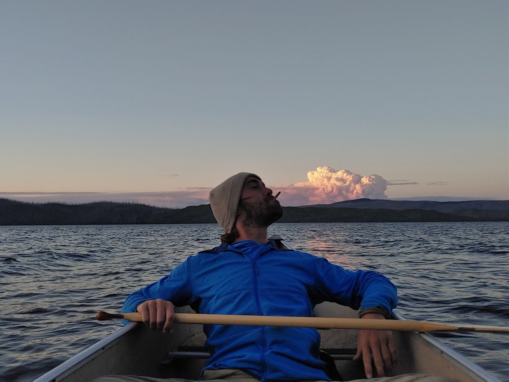 Polgy picked a route and we downclimbed beside the waterfall. Stepping down a wet slabby stretch I slipped and the bear gun slung on my back swung loose. I caught it and recovered but bent my knee in a creative direction. There was a tense minute, waiting and gauging the damage, knowing succor would not be forthcoming here. The knee was mobile and the play was to keep rolling with the adrenaline. We regained a watershed and swung and bounced down the overhanging saplings. It was the birch surfing boogie for kilometers. Emerging into the lake like a couple mountain goat turds flushed downstream, we waded the shoreline to locate ourselves then cut through brush to regain Jaundice. After paddling back across Surel to our trailhead it was Polgy’s turn to put the big yellow lady on his shoulders and heave her home. I offered rest breaks every couple minutes to test his resolve. He took a new strategy and bent double, letting his lower back take the strain. The sight and sound of an angry canoe floating choppily downhill a meter off the ground will stay with me. Credit to Polgy, he never put it down. After a swim we put some ice in the last of the whiskey and toasted Neil, a kindred spirit I never met but who surely also knew the sweetness of big days and slim margins.