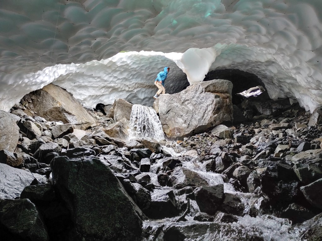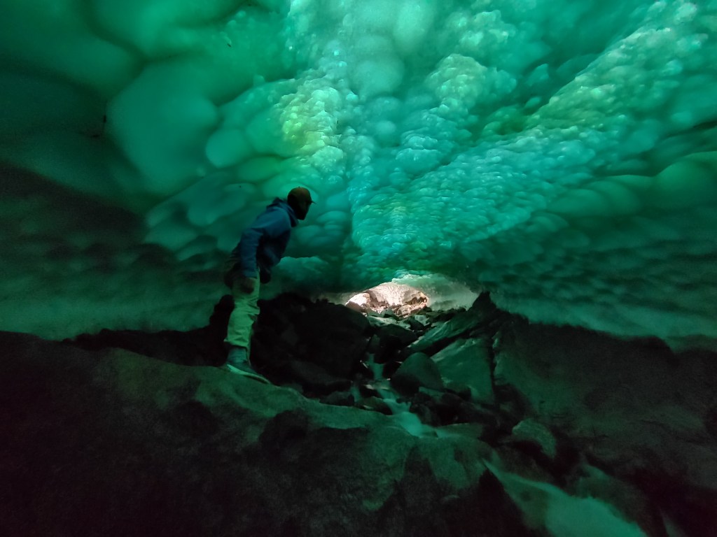 Inside we found a psychedelic green domed tunnel, possibly a wormhole, and we scampered up compulsively. We emerged partway up the mountain, through an elliptical hole melted through the glacier to a view of Mt Haven and beyond.