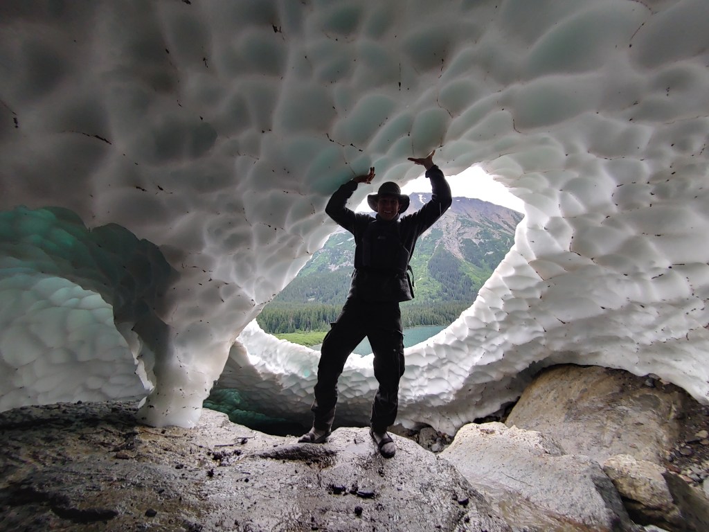 We used paddles to whack our way along an obsolete trail into Musclow Lake and pried our way into a boarded up cabin. Inside was an immortal aluminum frontiersman with a square transom. I used a handsaw and axe to clear windthrown trees and launch the relic. Circumnavigating the lake, we paused halfway to eat three trout apiece . On the return leg while eye-balling Mt. Musclow, a screaming Marmot jolted us. Several hundred meters of scree upslope of the marmot, a black hole into a melting glacier beckoned.