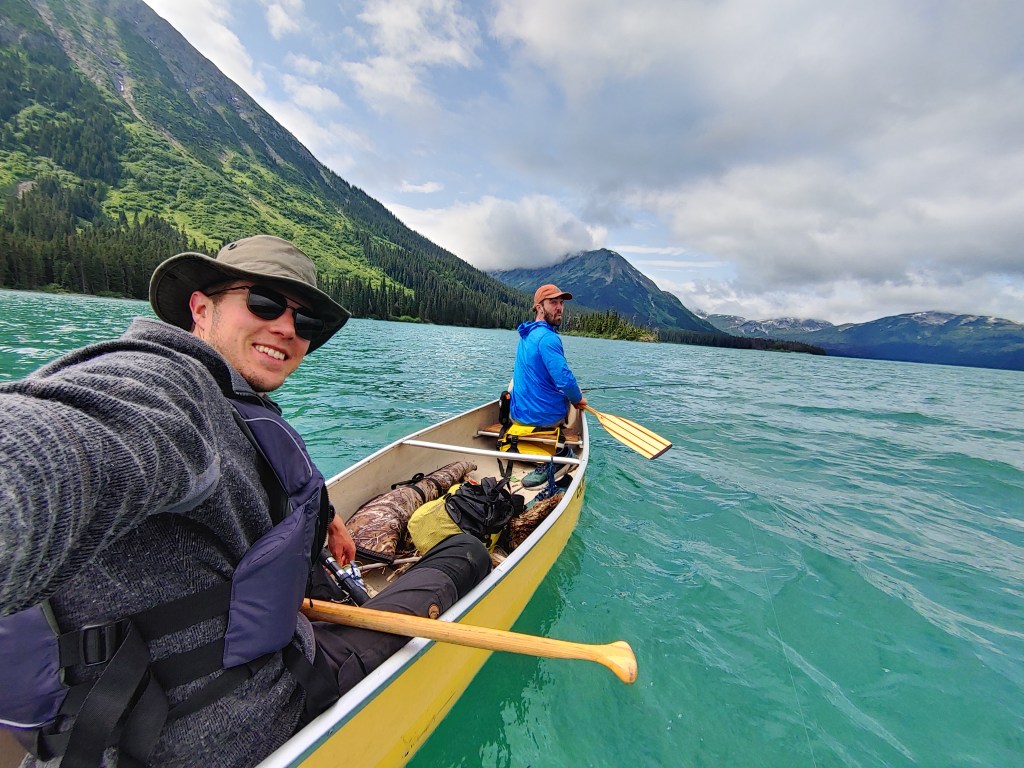 The water had more glacial influence here, glowing turquoise when the sunlight entered. We paddled alongside a residual glacier-iceberg and carved off some ice for our rye. We set up camp beside a river mouth and feasted on fish.
